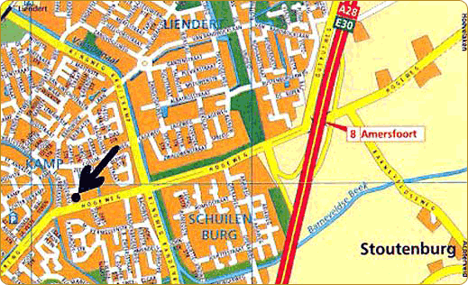 Ausfahrt Nummer 8 (Amersfoort - Hoevelaken). Unten an der Ausfahrt links abbiegen in Richtung Zentrum Amersfoort, Bei den ersten 4 Ampeln geradeaus fahren. Vor der fünften Ampel, genau in Höhe von der Esso Tankstelle (auf der linken Seite) biegen Sie rechtsab.
